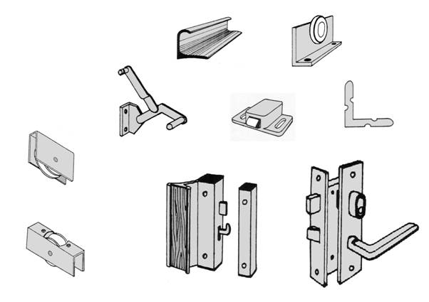 JALADERAS, CARRETILLAS, BISAGRAS, PIVOTES, TENSORES, ESCUADRAS, OPERADORES, RESBALONES, ETC.